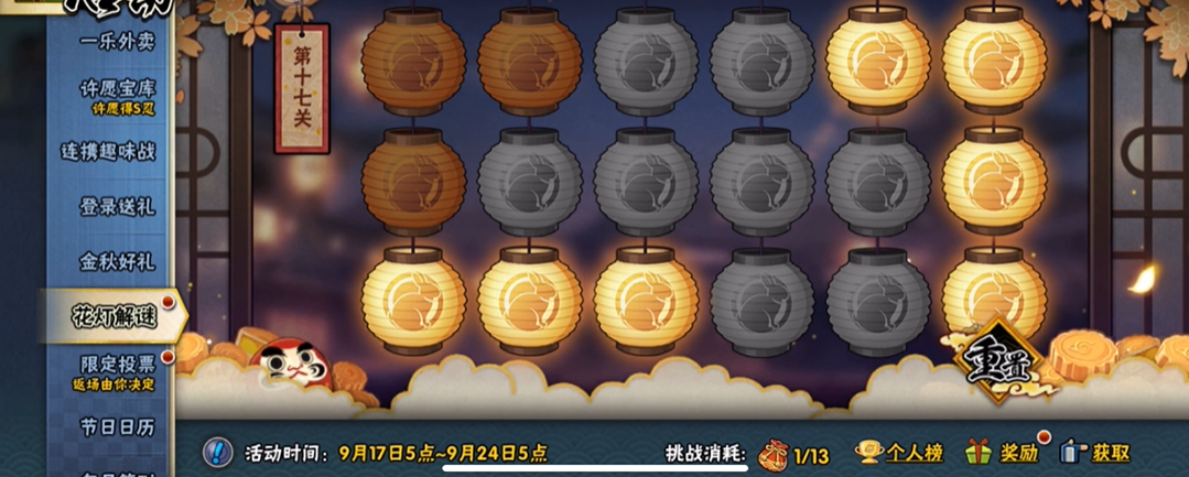 这个关卡是基于经典的熄灯游戏改的,它里面的5×6花灯矩阵,每个花灯的亮与不亮可以看作是一个二进制数。玩家的点击动作就像是做了异或运算。第17关的解决方案就是通过计算好的三个点击点,直接把花灯从全暗变成全亮。虽然点击后可能会看到花灯状态的变化,但这是正常的,只要按照步骤做三次点击,不用因为中间的状态变化而感到困惑。