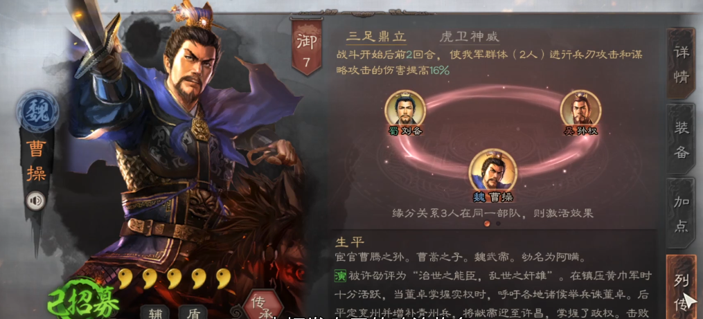 他与曹操、程昱组成的骑兵队伍是经典的搭配,曹操提供增伤和减伤,程昱补充谋略输出,夏侯惇则负责吸收伤害并打出反击。如果缺少核心武将,也可以用郭淮、满宠等武将替代,比如由夏侯惇、满宠和曹操(或郝昭)组成的藤甲兵反击盾阵容,利用藤甲兵的高额兵刃减伤和满宠的稳定治疗,在对抗物理队时表现出色。他与夏侯渊、曹仁一起上阵还能激活曹魏族将的缘分,获得前两回合的破阵状态,增强爆发能力。
