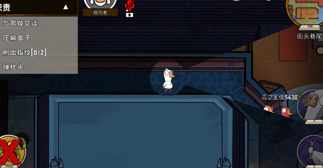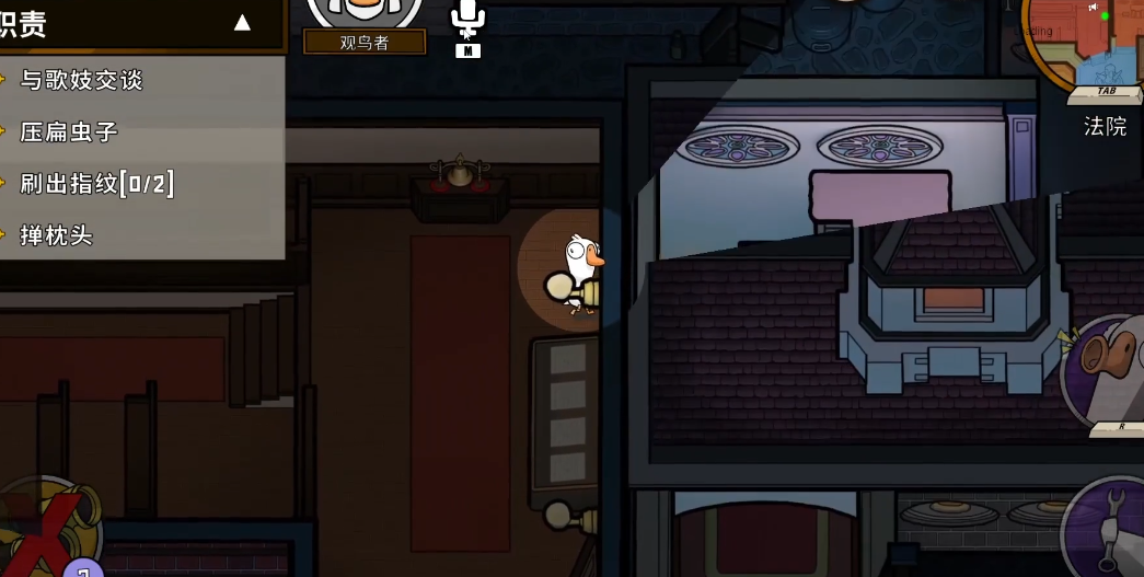 在游戏开始的时候,不建议观鸟者玩家一个人行动。更明智的做法是先找到可以信赖的队友,组成一个小团队,一起完成任务。这样不仅更安全,能降低被伪装成鹅的鸭子单独刺杀的风险,还能避免因为单独行动而被杀,导致无法留下有用的信息。不过,跟团队行动不代表就要被动,你还得时刻注意其他玩家的动向。