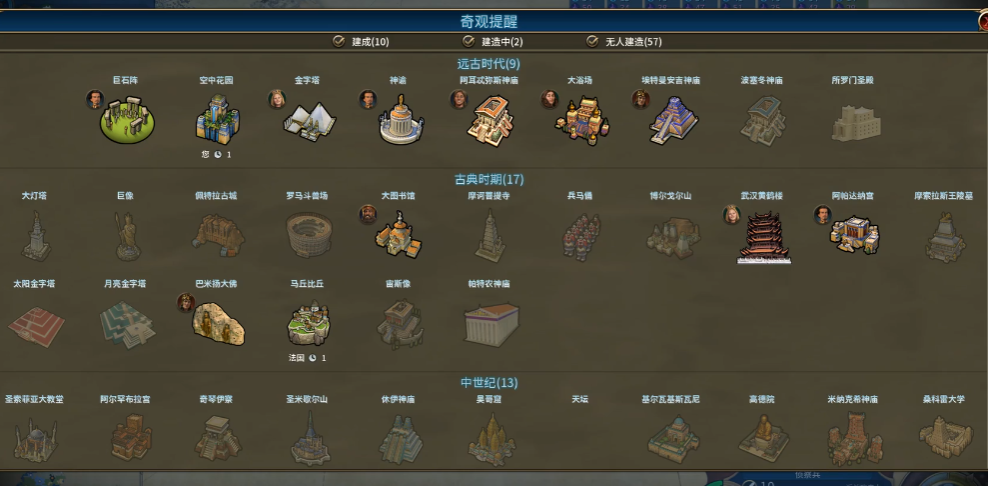 关于这个技能的前期运营策略非常清晰,那就是通过策略性地放置奇观的基础设施来最大化早期的文化收益。由于远古时代的奇观通常需要通过科技树解锁,所以在游戏开始时,迅速增加科技产出,尽早研究相关科技非常重要。游戏开始时,应该仔细观察首都周边的地形和资源,结合远古奇观对特定地形或资源的需要,预测可能的奇观建设位置。根据起始地形的特征,可以灵活调整初始科技研究的顺序,以便更快地解锁周边有建设条件的奇观。如果周边地块平坦,通常会优先研究畜牧业、制陶术等科技,为相关奇观的建设创造条件。这种周密的前期规划是为了在首都周围尽可能多地围绕市中心放置奇观基础,从而在游戏早期就建立起可观的滚雪球式文化优势。