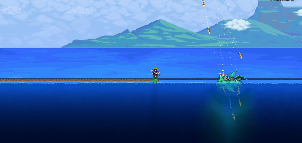 猪鲨公爵的战斗分为几个阶段,每个阶段都有特定的攻击方式需要应对。第一阶段,它会连续向你发起五次冲撞,然后停在空中,交替释放追踪泡泡或召唤水龙卷风。泡泡可以用武器攻击爆掉,而龙卷风则会发射穿透平台的鲨鱼龙,你需要绕着风眼边缘移动来躲避。当它的生命值降到一半以下时,进入第二阶段,此时它的速度和伤害都会增加,释放的泡泡数量更多,并且会召唤追踪你的大型水龙卷,这个阶段要优先处理威胁大的龙卷风。在专家或大师模式下,当它生命值极低时,进入第三阶段,屏幕变暗,Boss隐身并开始连续的瞬移冲刺,这时利用重力药水进行垂直方向上的反复升降飞行是较为安全的躲避方法,同时要密切关注小地图上它的图标来判断其位置。