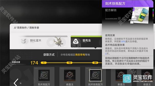 3、你可以看到紫色和蓝色品质的复活药(刻术瓶),收集足够的萤壳虫就能解锁