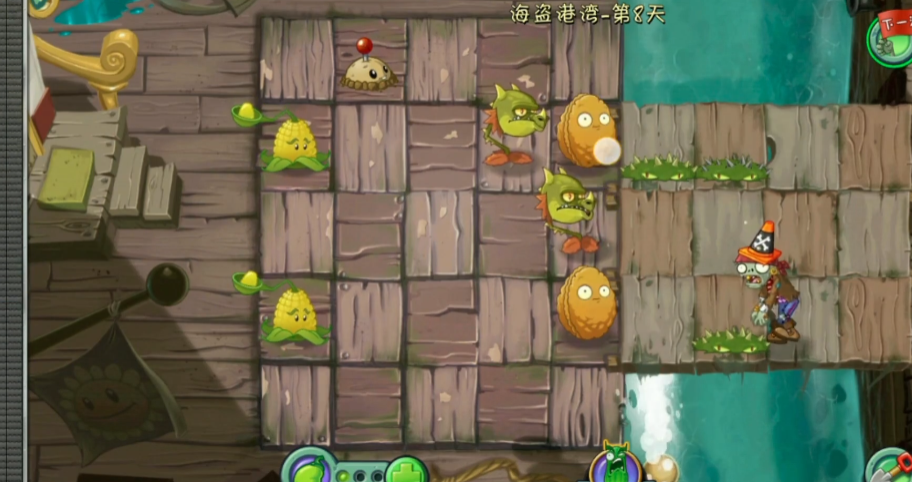 来到海盗港湾的第八关卡,这是一个考验传送带技巧的关卡。拿到植物后要立即种植,不要留在传送带上。建议将火龙草种植在第二行和第四行,与地刺和玉米投手结合,形成交叉火力。当最后一波僵尸来袭时,把所有能量豆都投入火龙草,可以达到很好的清理效果。但务必注意,至少保留一个能量豆以防海盗船长僵尸的鹦鹉偷走关键植物。