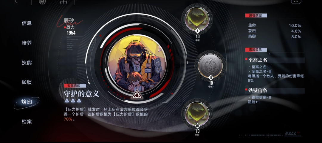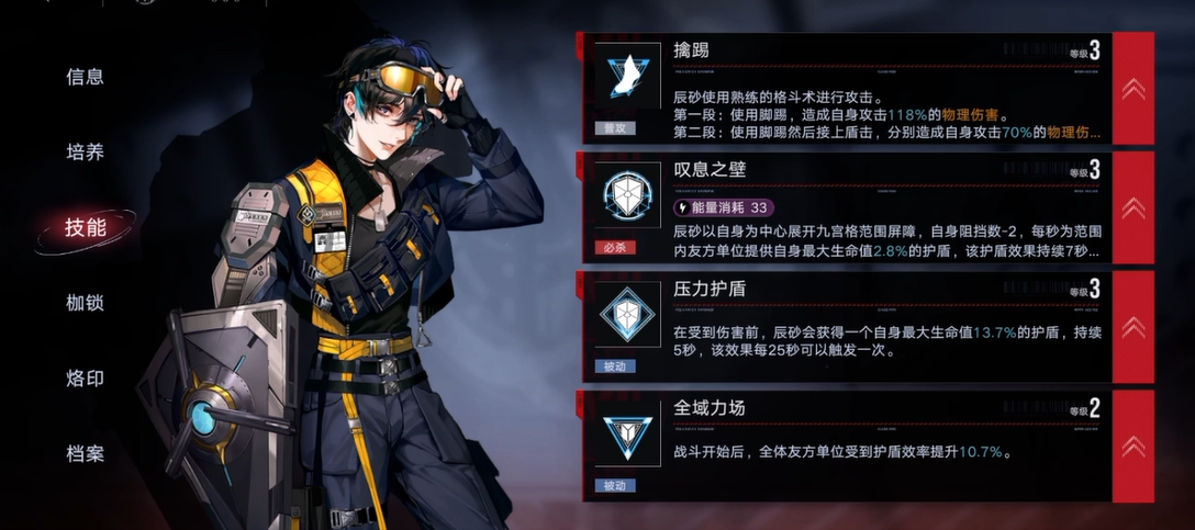 如果你的阵容急需一个能提供群体保护的坚实前排,而你还没有更高阶的同类角色,那么投入资源培养辰砂是一个合理的选择。在培养资源配置上,应优先提升其等级和生命值属性以增强护盾效果,并适时进行升阶解锁关键的技能加成与烙印栏位。在技能升级方面,应优先保证绝技“叹息之壁”的等级,其次是被动技能“全域力场”,以最大化其团队辅助收益。在烙印搭配上,可以选择进一步提升生命值、防御力或强化护盾效果的烙印套装,使其防护能力更为坚固。通过这种针对性的培养,辰砂能有效巩固你的防线,为团队创造更安全的输出环境。