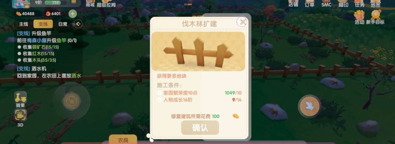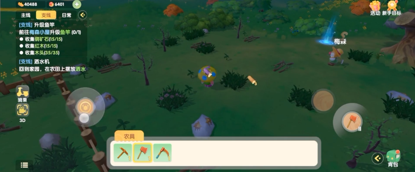 除了家中,还有一个公共区域的伐木林,它位于前哨站的右侧。伐木林中的资源并非取之不尽,但它会自动更新。前一天被砍伐的树木和挖掘的石头,第二天会重新生长和刷新,因此你可以每天来采集一轮。木材、石头、草,这些都是早期提升农具、建造家园设施、完成小镇捐赠任务的必需品,需求量很大。