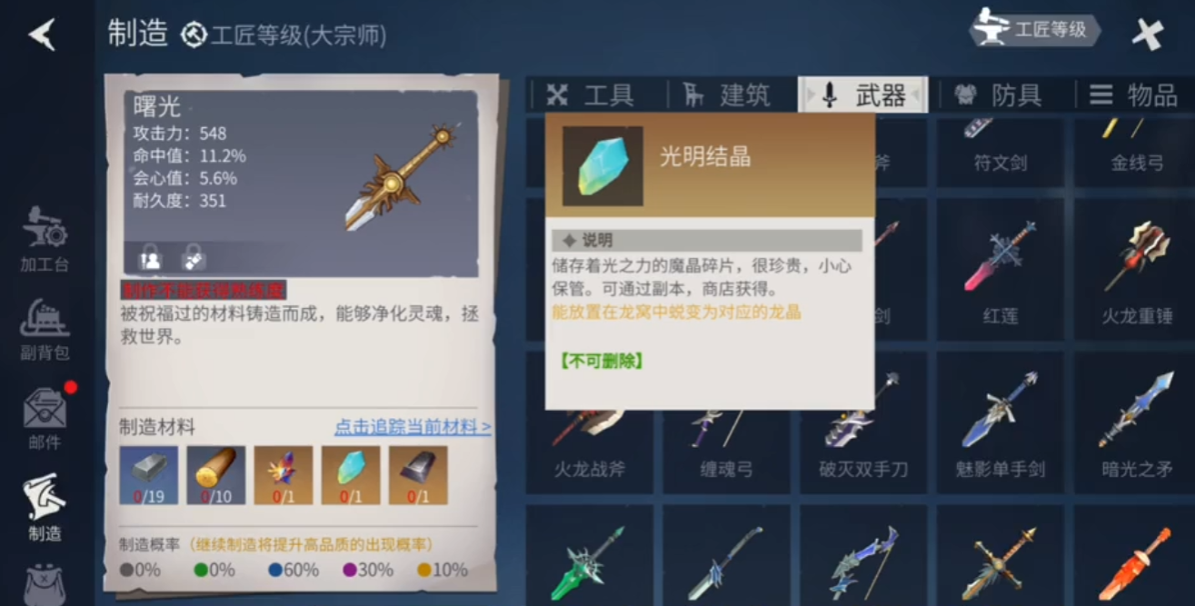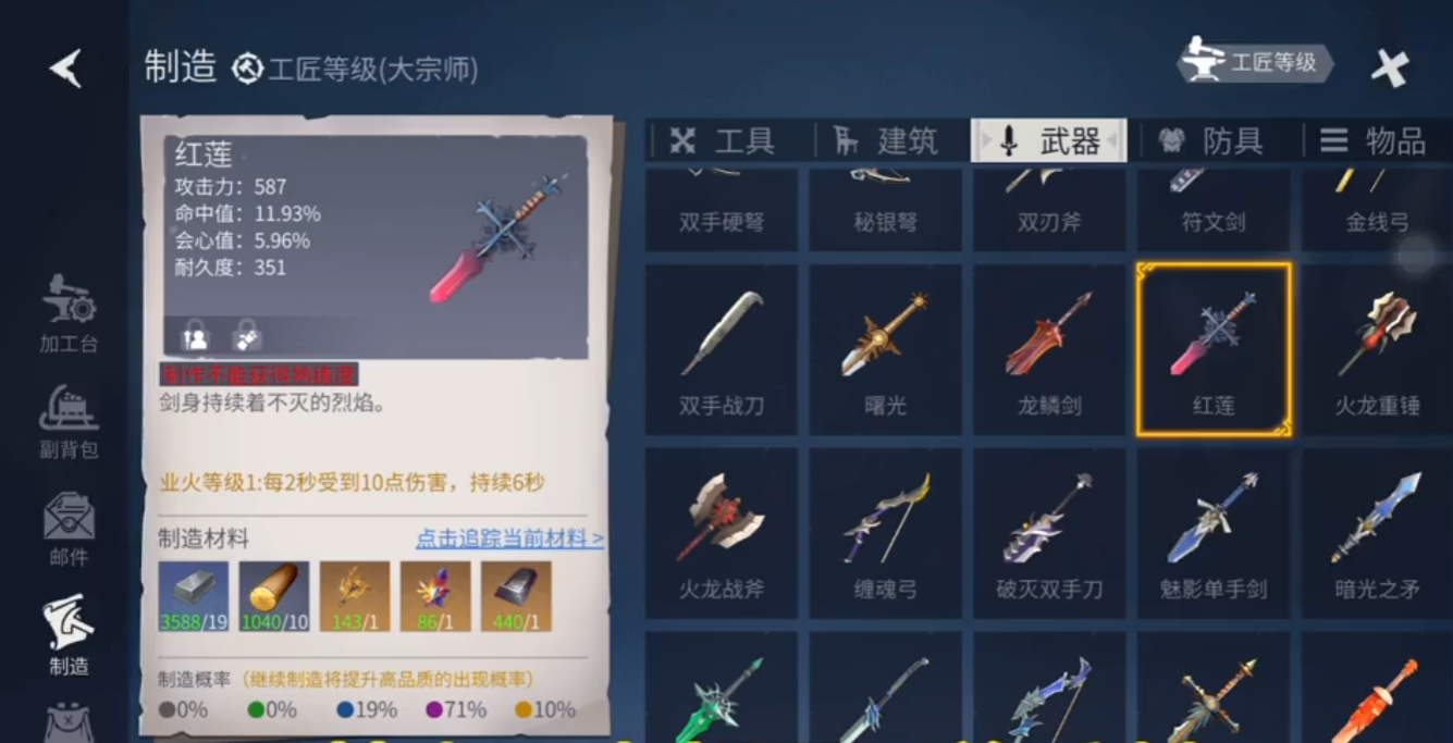 要制作出具有金色稀有度和强大属性的曙光和红莲武器,通常需要工匠等级达到大师9级或更高。如果你的工匠等级不够,即使制作出来,也很可能是属性较低的白板武器。由于获取成本较高,它们通常不是玩家毕业前的首选武器。