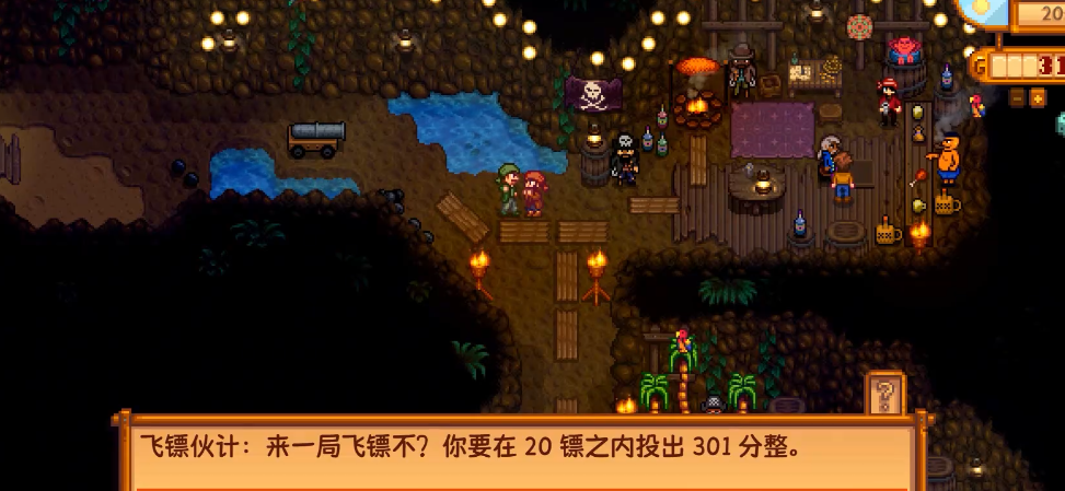 海盗湾内部,玩家可以进行多种活动并获得奖励,其中最重要的是收集金核桃。进入湾内后,你可以在钓黄貂鱼的地点附近挖掘土地,直接获得一个隐藏的金核桃。湾内有一个海盗酒吧,与其中一位喝酒的海盗对话可以玩飞镖游戏。游戏要求玩家瞄准移动靶心,通过长按按键来稳定准星,得分必须恰好达到规定数值。成功赢得前三局飞镖游戏,每次都会奖励一个金核桃,总共三个。所以,在海盗湾,玩家通过挖掘和游戏总共可以获得四个金核桃。