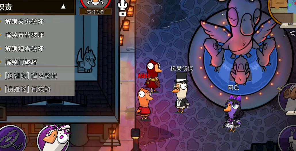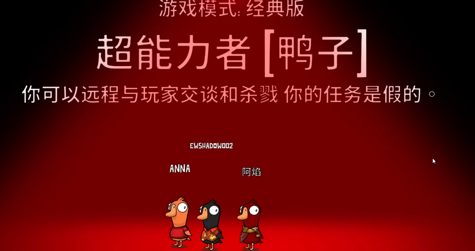复仇者属于正义一方,他们的关键能力是在目睹一起谋杀后,短时间内获得无惩罚的击杀权。超能力者的身份则较为复杂,它可能是指正义方的超能力鹅,其任务是阻止恶势力的破坏;但更常被提及的是邪恶方的超能力鸭,这个角色的能力更加主动,能够远程锁定一名玩家,并触发一个大约18秒的倒计时。在这段时间里,超能力鸭可以与被锁定者进行秘密对话。如果倒计时结束且未被中断,被锁定者将死亡,而且超能力鸭在技能的后半段会跟随目标移动并固定自己的位置。了解这两种角色的基本定位是制定战术的基础。