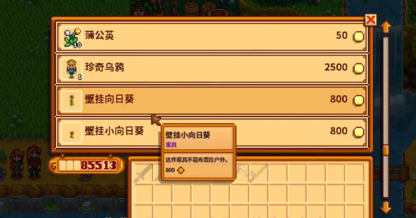 在节日现场,你可以随意和所有到场的村民聊天,但并不是所有村民都能被邀请跳舞。现场有皮埃尔开设的临时摊位,售卖一些特别商品。这些商品一般有春季常见的野花和一些稀有的装饰品,其中特别值得收藏的是珍奇乌鸦稻草人,它和收集成就有关。