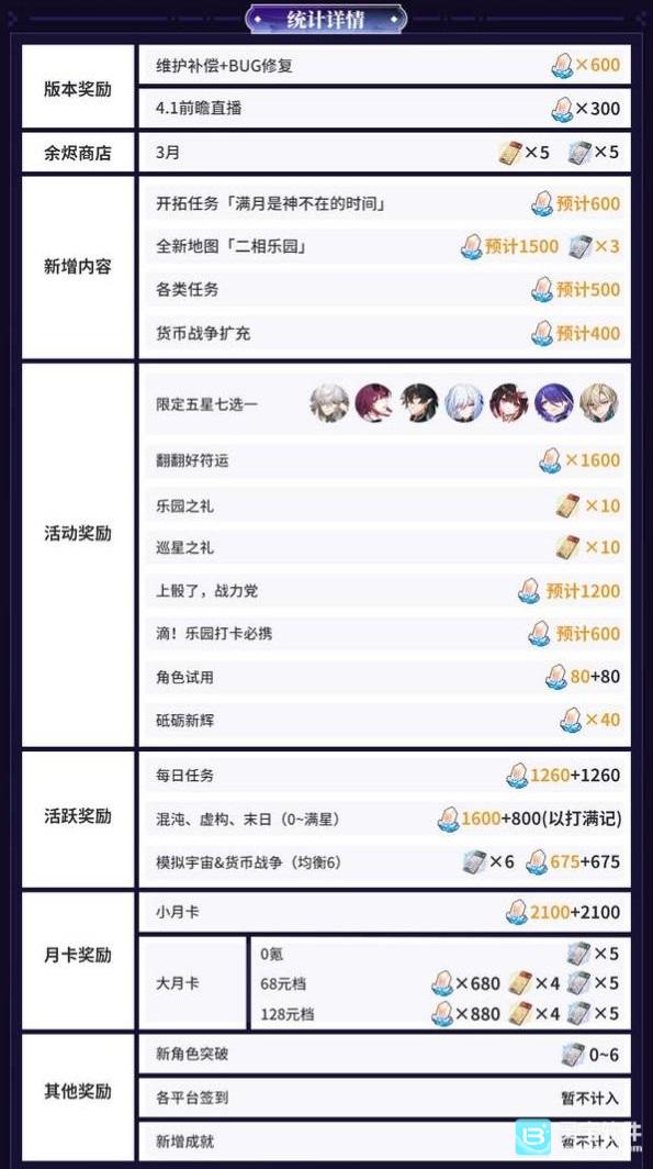 崩坏星穹铁道4.0【满月是神不在的时间】将在后天(2月13日)正式上线!这次4.0版本带来了全新地图、两位新角色(爻光和花火)以及更多剧情和活动。那么有人就要问了,在4.0版本中可以攒多少抽?可以获得多少数量的星琼呢?这里灵宝就为你带来详细...