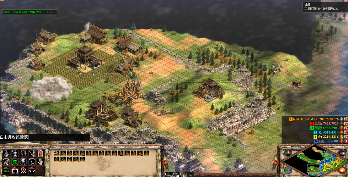 开局应立即派遣最初的4轻骑和6骑射手进行侦查,了解基地周边的资源分布和敌人的位置,特别是要找到地图右下角的金国岛屿。同时,将基地建在靠近海岸的区域,方便后续的行动。你的首要任务是快速收集木材和食物,尽快升级到城堡时代,并优先建造城墙、箭塔等防御工事来保护经济区域,防止早期袭击,为后续的军事扩张打下坚实的基础。