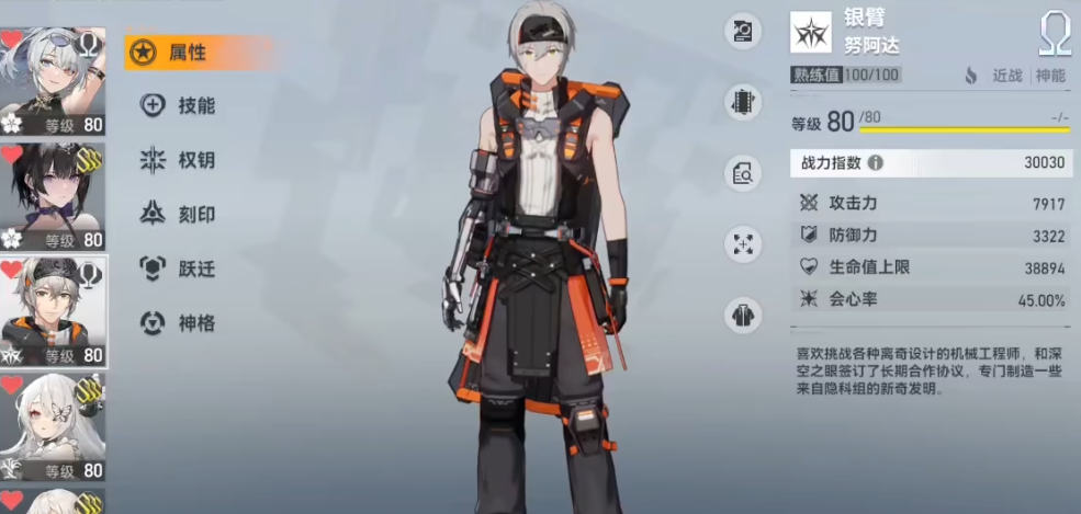 银臂·努阿达是A级火系伤害输出角色,擅长进入高能过载状态,在此状态下获得无敌并反击敌人,神格提升后还能恢复自身生命值,对机械敌人有特殊攻击效果。该角色可以与龙切·迦具土或狂鳄·索贝克配合,触发连携奥义,分别为队伍提供火属性伤害提升或高能过载状态,从而增强近战输出能力。