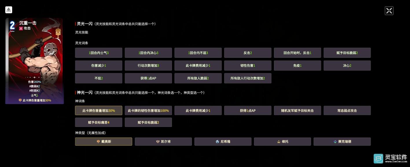 第二张卡牌是“神圣一击”,在进入“消灭”状态后,这张卡牌的伤害可以达到200%,流血量非常可观。建议搭配的词条有“卡牌的韧性增加100%”、“此卡费用减少1”、“赋予目标痛苦4”,这四个词条不仅能够降低相关费用,还能在流血量上提供强大支持。