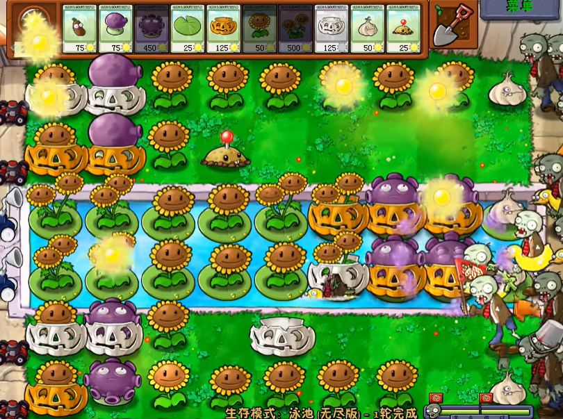 合理的植物组合是长期生存的关键,组合通常围绕高输出和控制类植物进行,常见的组合方式是以玉米加农炮为核心火力,配合冰西瓜提供全局减速,用忧郁菇清除大量普通僵尸,而在防守方面则需要依靠南瓜头保护关键植物,形成自动化或半自动化的防守模式。