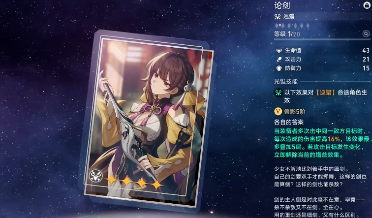 根据命途的不同,输出型四星光锥各有特点。对于毁灭命途的角色,建议优先考虑秘密誓心,因为它提供的无条件增伤和基于生命值的额外增伤机制,适用于大多数输出环境,尤其适合那些依赖生命值转换伤害的角色。巡猎命途的角色则更适合使用论剑,它对单体目标的增伤效果明显,适合频繁攻击单一目标的战斗环境;而沉默则提供攻击力和暴击率的加成,在敌人数量较少时更有优势。对于智识命途的角色,今日亦是和平的一日是一个不错的选择,它提供的伤害加成机制具有很高的适用性。而对于依赖追加攻击或终结技的特定智识角色,还有其他更专业的光锥可供选择。