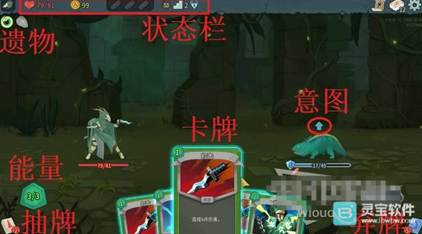 状态栏下方显示你本局获得的遗物,左下角则是当前剩余的能量和抽牌堆。使用卡牌时会消耗能量,当能量耗尽时,你必须结束当前回合。