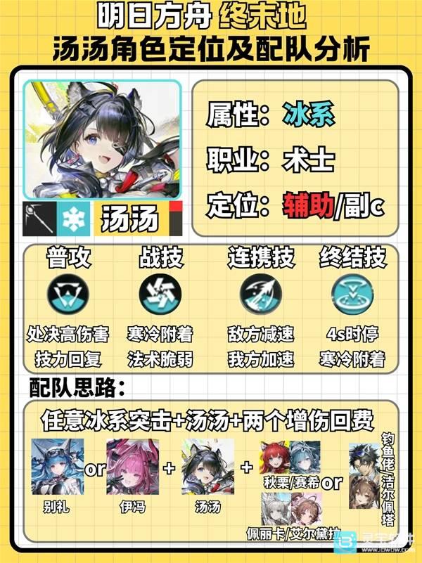 汤汤可以说是冰属性队伍的一大助力,她快速释放的冰冻技能能够缩短主输出角色爆发的准备时间,同时还具备法术弱点、减速、加速和技力恢复等辅助效果,甚至还有不俗的输出能力。如果你是冰属性队伍的爱好者,想要加强队伍的战斗力,汤汤绝对是必抽的角色!