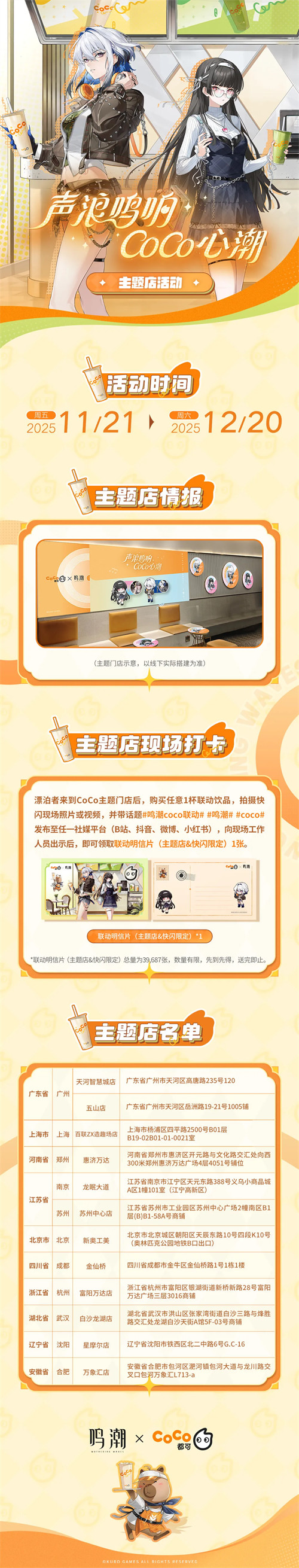 随着声浪的激荡,CoCo的情感涌动。11月21日,鸣潮与CoCo都可官方的联合活动即将拉开序幕,届时将推出一系列联动套餐和主题门店。